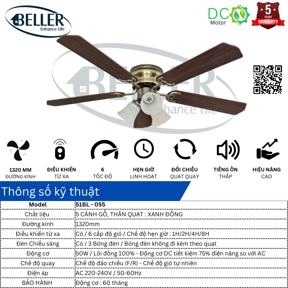 Quạt trần Beller 51BL – 055 cánh quạt được thiết kế cho luồng không khí tối ưu, động cơ và cánh quạt cân bằng chính xác để vận hành không rung lắc. Động cơ có ba tụ điện và có 6 tốc độ gió, động cơ đảo chiều có công suất cao cấp với cảm ứng mô-men xoắn 165.5 X 15 mm để vận hành êm ái.