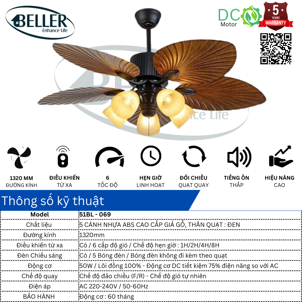Quạt trần 51BL – 069 động cơ DC 6 tốc độ gió,công suất động cơ lên tới 50W, động cơ khoẻ, lắp lên mát, độ tản gió rộng, quạt có đầy đủ chế độ đảo chiều, chế độ hẹn giờ thông minh ….quạt không chỉ có chức năng làm mát mà còn được đính kèm thêm 5 chao đèn bằng thuỷ tinh, tiết kiệm được diện tích đáng kể và không phải lắp nhiều thiết bị chiếu sang xung quanh phòng