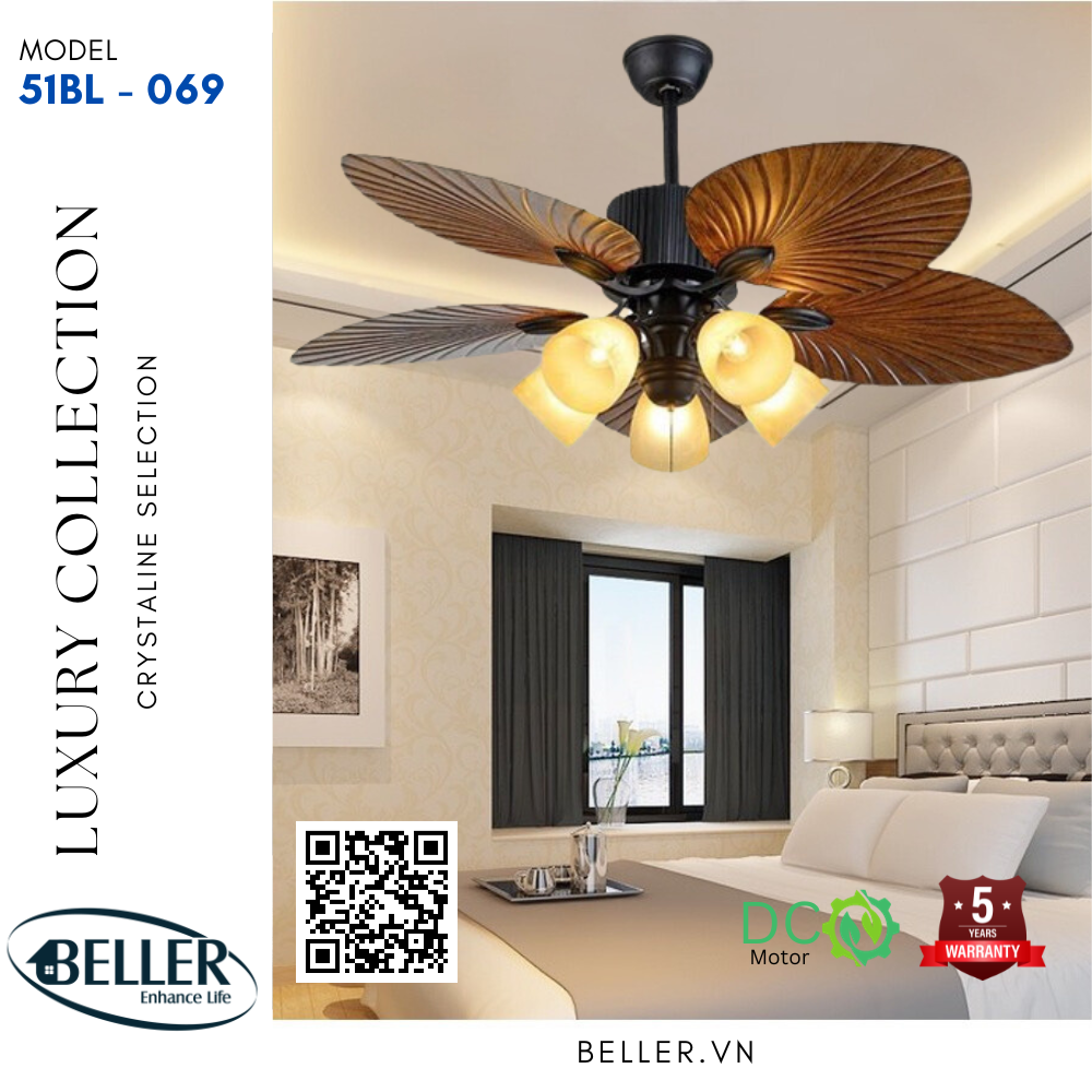 Hiện nay, có rất nhiều loại quạt trần được thiết kế phù hợp với mọi không gian từ truyền thống tới hiện đại, từ phòng khách cho tới phòng ngủ, phòng bếp, mái hiên với sự đa dạng về chất liệu như cánh gỗ hay cánh nhựa cao cấp. Công ty Beller giới thiệu tới bạn dòng quạt trần đèn 51BL – 069 cánh nhựa, quạt được sử dụng tông màu trầm, cánh quạt bằng nhựa abs cao cấp giả gỗ, thân quạt màu đen, sự kết hợp hài hoà tinh tế phù hợp với nhiều nội thất màu khác nhau, cánh quạt được cách điệu hình cánh lá tăng tính thẩm mỹ cho quạt