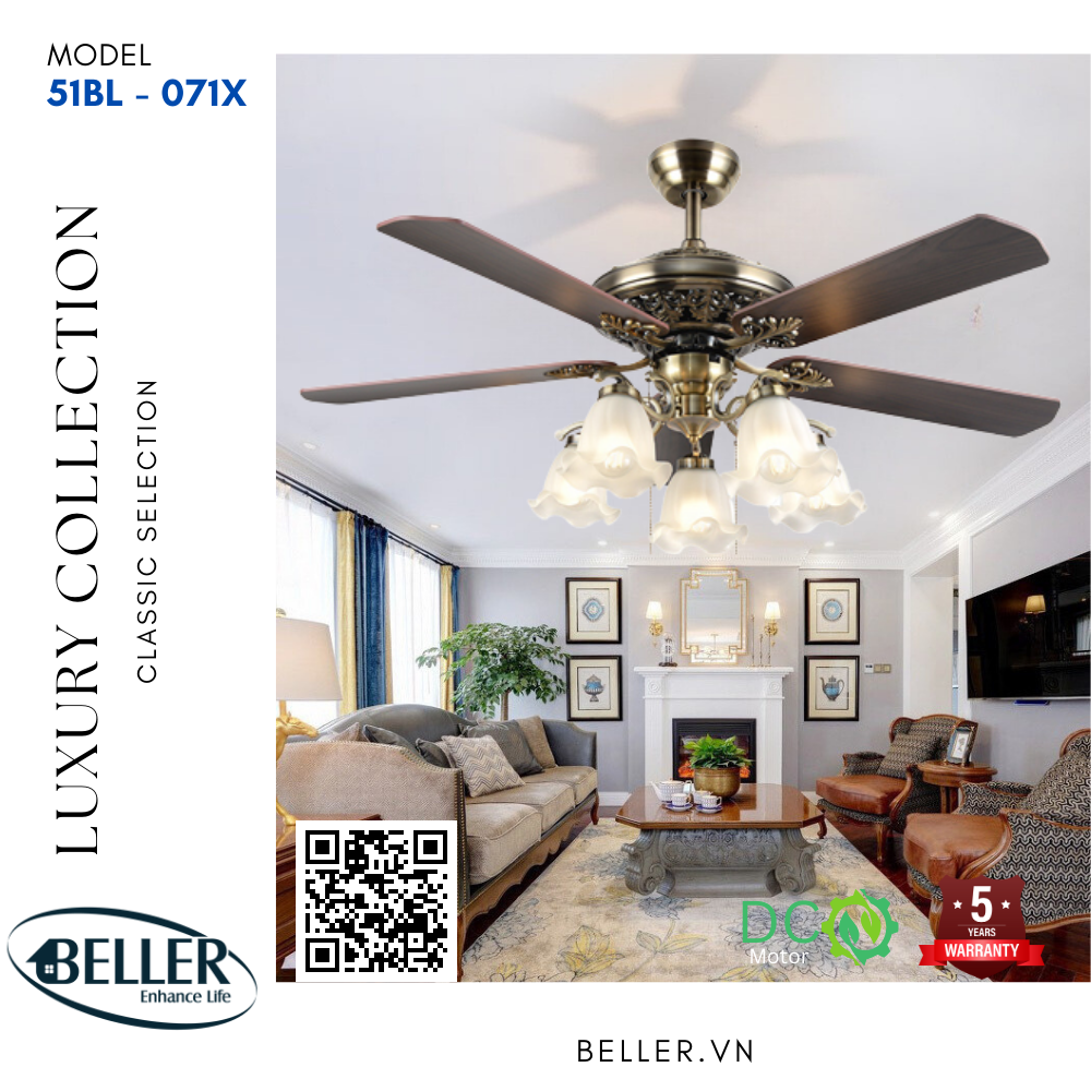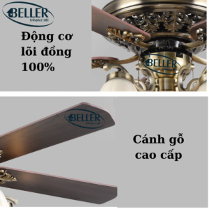 Quạt trần Beller 51BL – 071X cánh quạt được thiết kế cho luồng không khí tối ưu, động cơ và cánh quạt cân bằng chính xác để vận hành không rung lắc. Động cơ có ba tụ điện và có 6 tốc độ gió, động cơ đảo chiều có công suất cao cấp với cảm ứng mô-men xoắn 165.5 X 15 mm để vận hành êm ái.