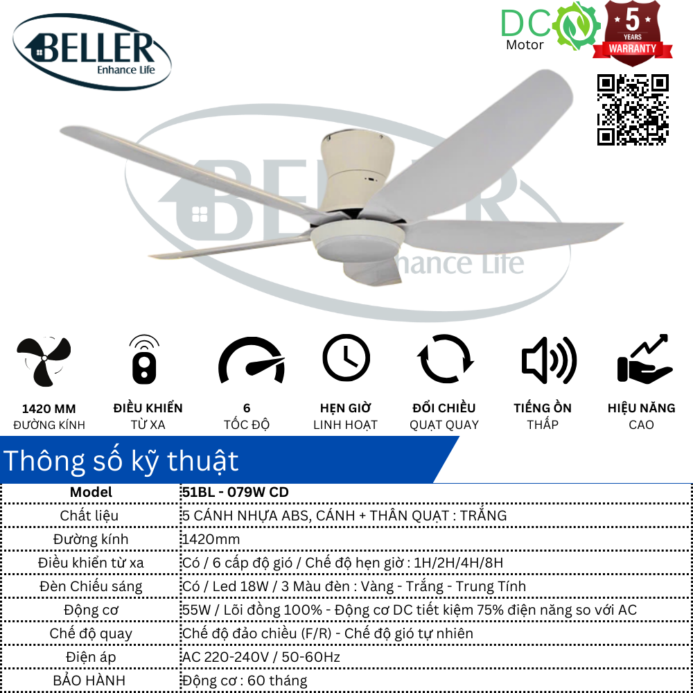 Quạt trần 51BL – 079W CD động cơ DC 6 tốc độ gió,công suất động cơ lên tới 55W, động cơ khoẻ, lắp lên mát, độ tản gió rộng, quạt có đầy đủ chế độ đảo chiều, chế độ hẹn giờ thông minh ….quạt được sử dụng cánh quạt bằng nhựa ABS cao cấp giả gỗ, nhìn quạt vừa đơn giản nhưng không mất đi tính thẩm mỹ, sự kết hợp màu sắc hài hoà phù hợp với nhiều thiết kế nội thất khác nhau