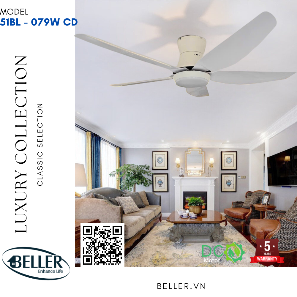 Quạt trần Beller 51BL – 079W CD cánh quạt được thiết kế cho luồng không khí tối ưu, động cơ và cánh quạt cân bằng chính xác để vận hành không rung lắc. Động cơ có ba tụ điện và có 6 tốc độ gió, động cơ đảo chiều có công suất cao cấp với cảm ứng mô-men xoắn 165.5 X 15 mm để vận hành êm ái.