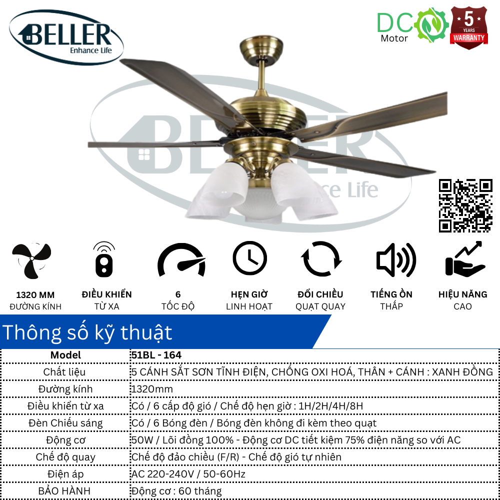 Đại diện cho phái đẹp – mát – gu thẩm mỹ tinh tế BELLER xin được giới thiệu đến người tiêu dùng mẫu quạt đèn trần BELLER 51BL – 164, một sự lựa chọn hoàn hảo của khách hàng.