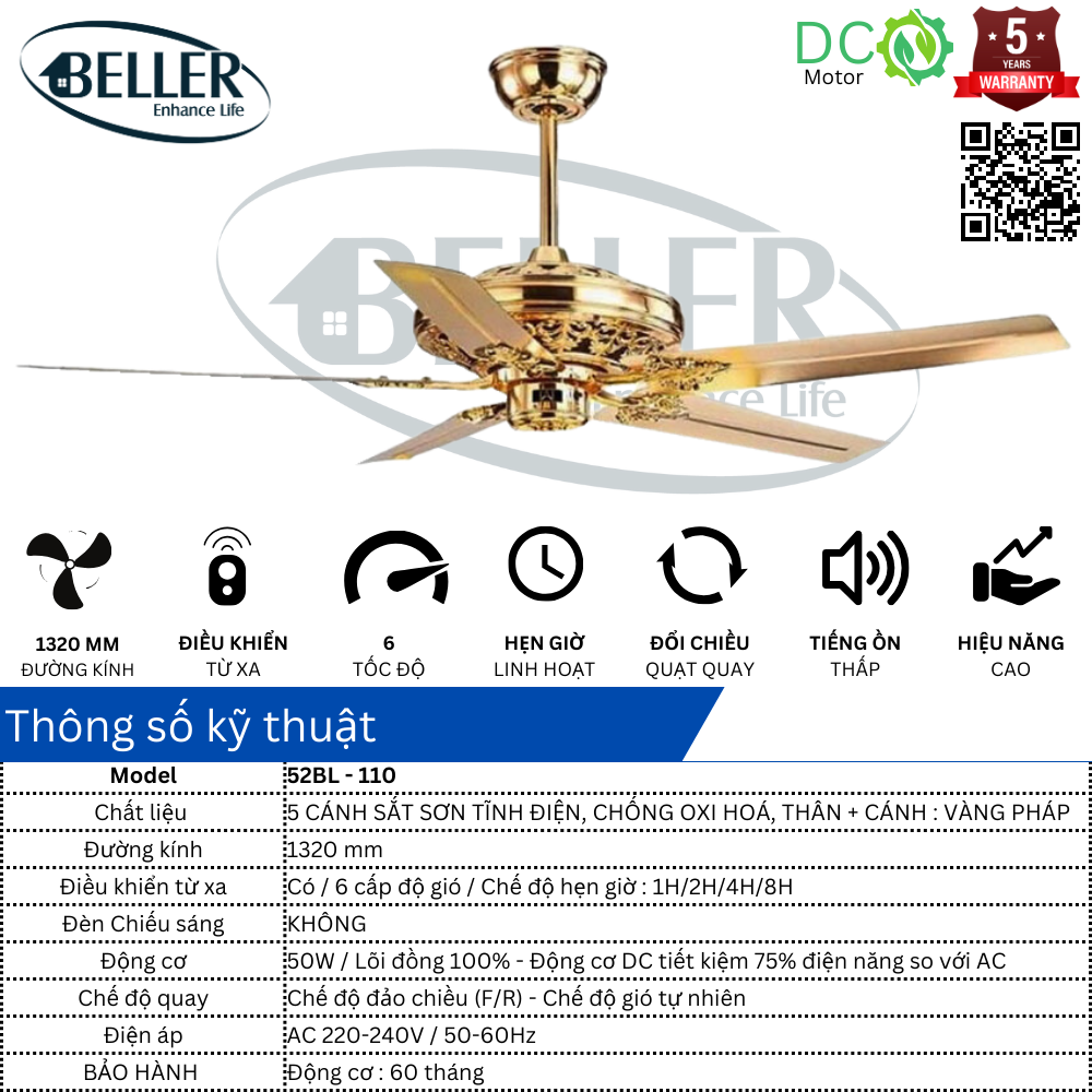Quạt trần 52BL – 110 động cơ DC 6 tốc độ gió,công suất động cơ lên tới 50W, động cơ khoẻ, lắp lên mát, độ tản gió rộng, quạt có đầy đủ chế độ đảo chiều, chế độ hẹn giờ thông minh ….