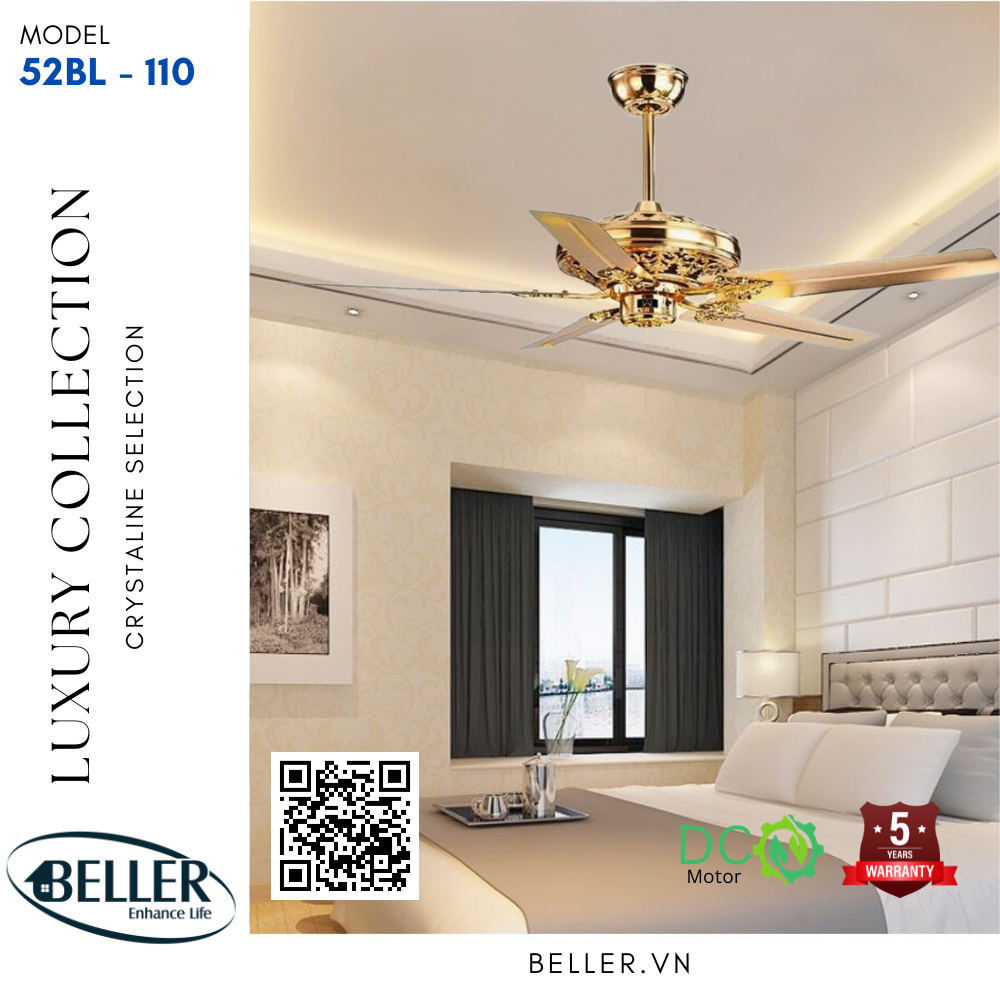 Quạt trần 52BL – 110 sắc màu chủ đạo màu vàng, khi nhắc đến màu vàng chúng ta sẽ nghĩ ngay đến sự giàu sang và bắt mắt, chính vì vậy lắp mẫu quạt này lên sẽ thu hút ánh mắt của mọi người giúp cho không gian phòng trở nên sang trọng, đẳng cấp hơn