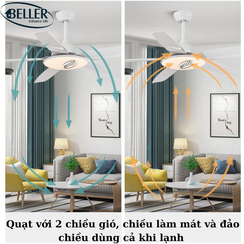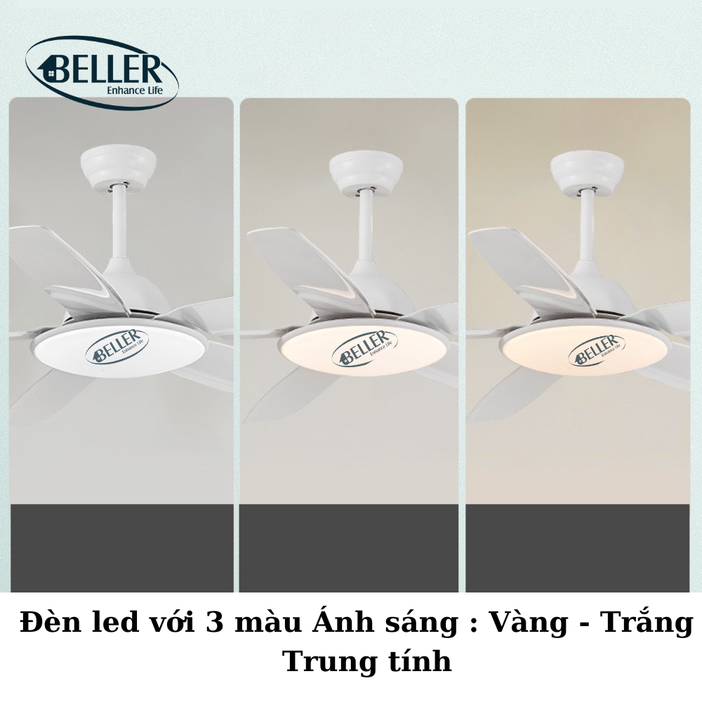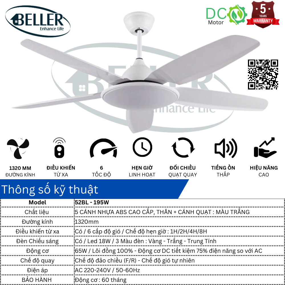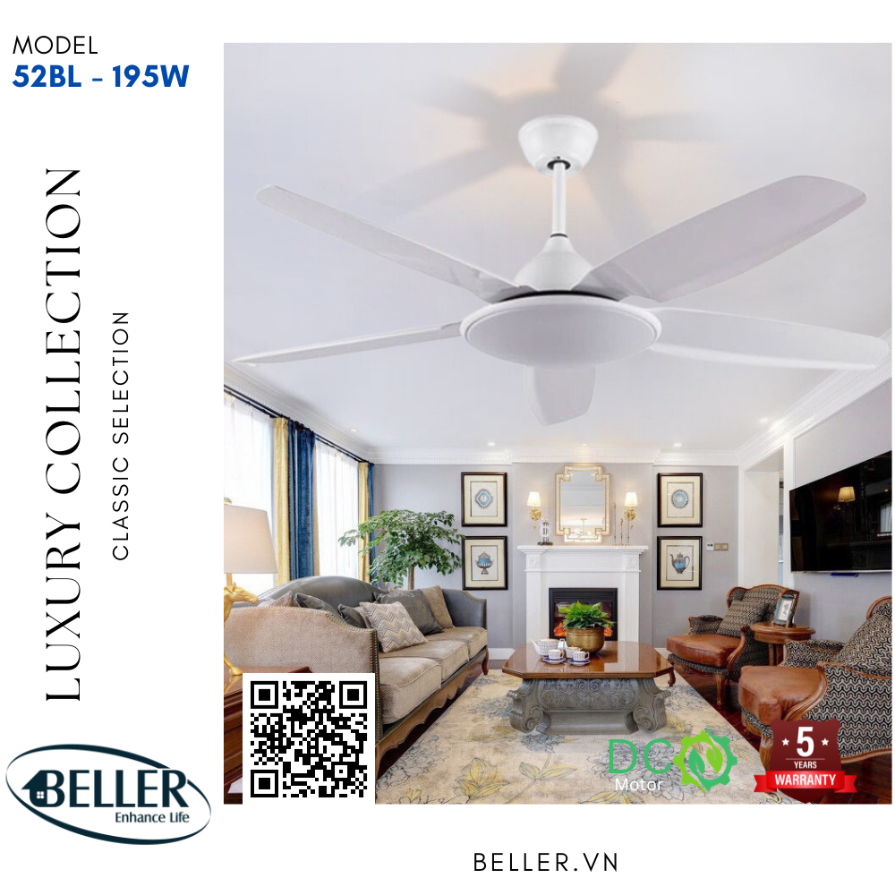 Quạt trần Beller 52BL – 195W cánh quạt được thiết kế cho luồng không khí tối ưu, động cơ và cánh quạt cân bằng chính xác để vận hành không rung lắc. Động cơ có ba tụ điện và có 6 tốc độ gió, động cơ đảo chiều có công suất cao cấp với cảm ứng mô-men xoắn 165.5 X 15 mm để vận hành êm ái.