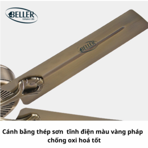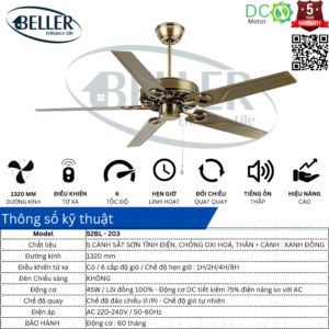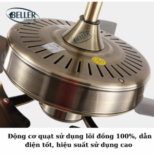 Quạt trần Beller 52BL – 203 với sắc chủ đạo xanh đồng, cánh quạt được thiết kế cho luồng không khí tối ưu, động cơ và cánh quạt cân bằng chính xác để vận hành không rung lắc. Động cơ có ba tụ điện và có 6 tốc độ gió, động cơ đảo chiều có công suất cao cấp với cảm ứng mô-men xoắn 165.5 X 15 mm để vận hành êm ái.