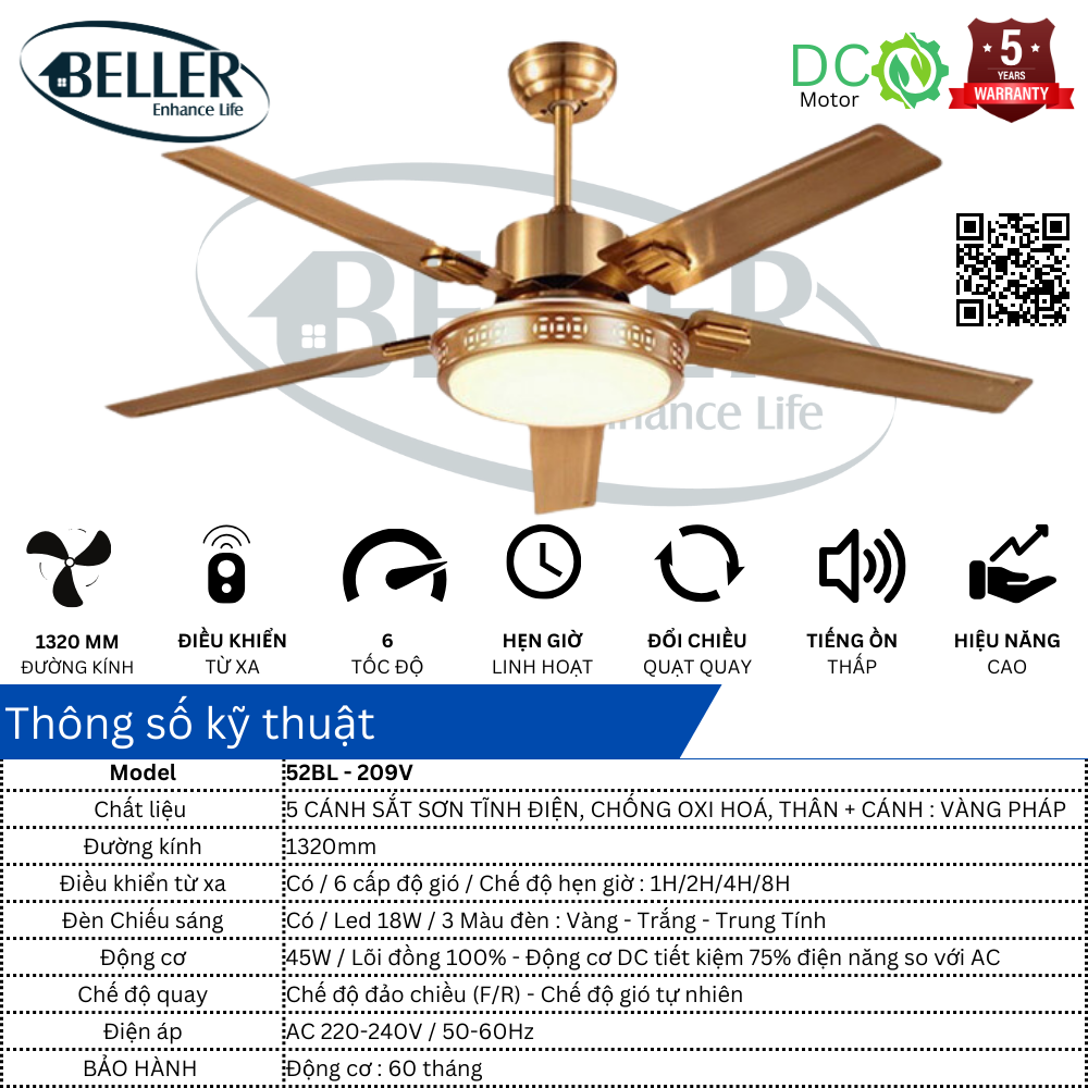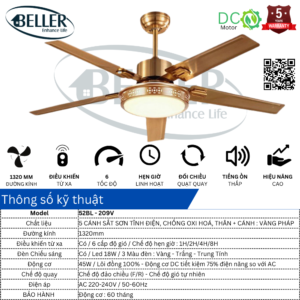 BELLER hiện nay là dòng quạt được nhiều khách hàng để ý nhất khi gây ấn tượng với sự kết hợp hoàn hảo giữa 2 phong cách. Cụ thể với mẫu Quạt trần đèn 52BL – 209V – Sự cổ điển được thể hiện rõ ràng trong phần thiết kế khắc nét xung quanh chao đèn kết hợp với nét hiện đại bởi động lõi đồng 100% và được bao phủ vỏ bọc của quạt sơn tĩnh điện tốt nhất trong thị trường sử dụng.