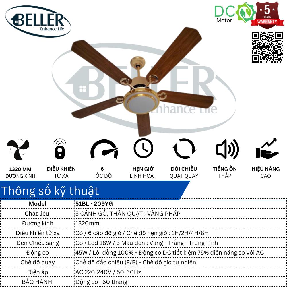 Quạt trần BELLER 52BL – 209YG cánh quạt được thiết kế cho luồng không khí tối ưu, động cơ và cánh quạt cân bằng chính xác để vận hành không rung lắc. Động cơ có ba tụ điện và có 6 tốc độ gió, động cơ đảo chiều có công suất cao cấp với cảm ứng mô-men xoắn 165.5 X 15 mm để vận hành êm ái.