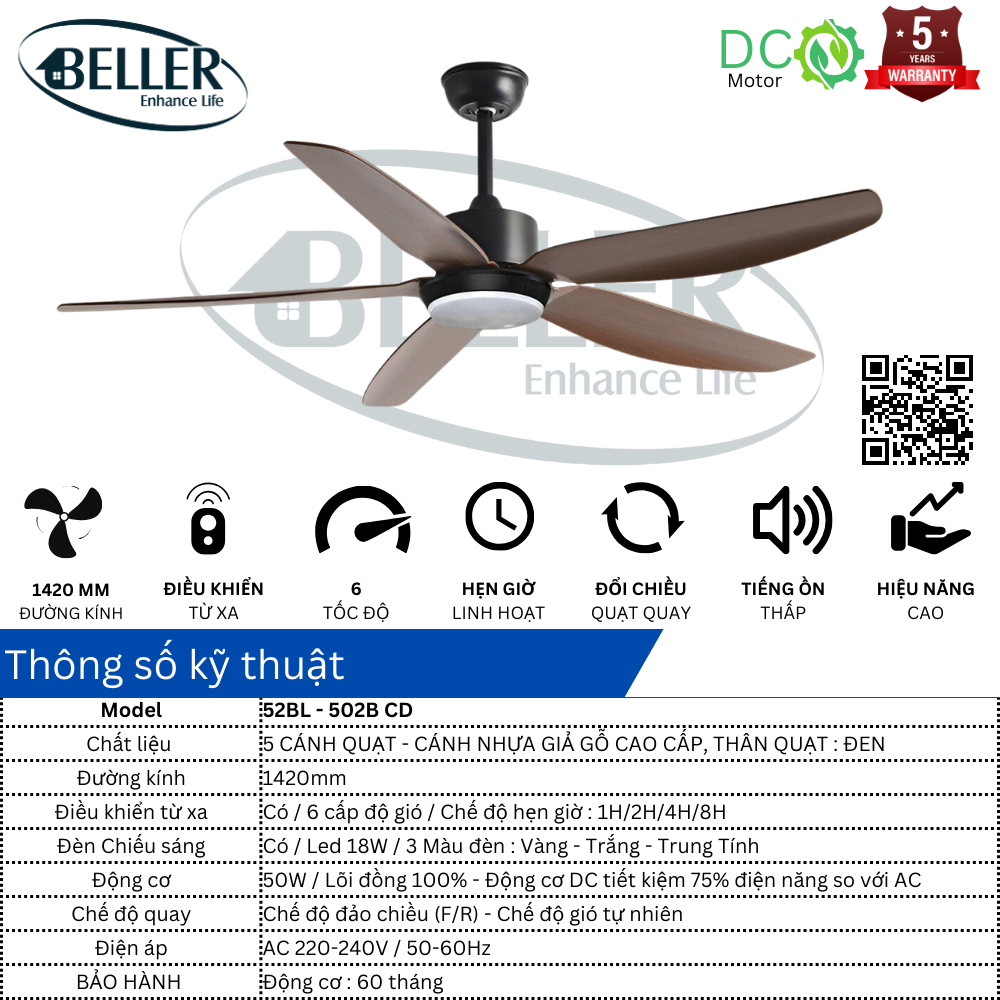 Mẫu sản phẩm Quạt trần đèn BELLER 52BL – 502B CD hội tụ đầy đủ chức năng và tiện ích giúp người tiêu dùng cảm thấy hài lòng nhất