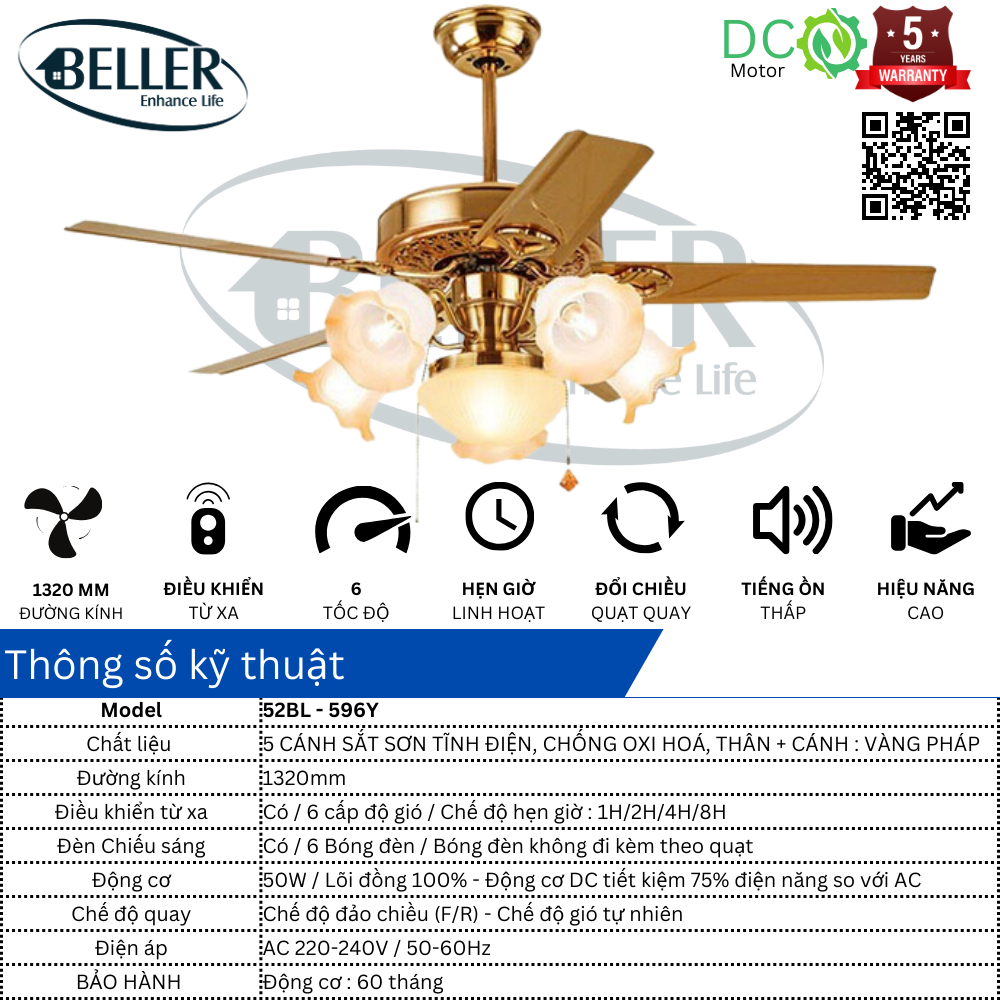 Quạt trần đèn 52BL – 596Y cánh quạt được thiết kế cho luồng không khí tối ưu, động cơ và cánh quạt cân bằng chính xác để vận hành không rung lắc. Động cơ có ba tụ điện và có 6 tốc độ gió, động cơ đảo chiều có công suất cao cấp với cảm ứng mô-men xoắn 165.5 X 15 mm để vận hành êm ái.