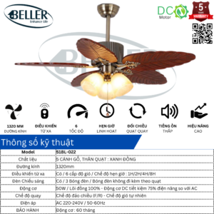 Quạt trần Beller 51BL – 022 cánh quạt được thiết kế cho luồng không khí tối ưu, động cơ và cánh quạt cân bằng chính xác để vận hành không rung lắc. Động cơ có ba tụ điện và có 6 tốc độ gió, động cơ đảo chiều có công suất cao cấp với cảm ứng mô-men xoắn 165.5 X 15 mm để vận hành êm ái.