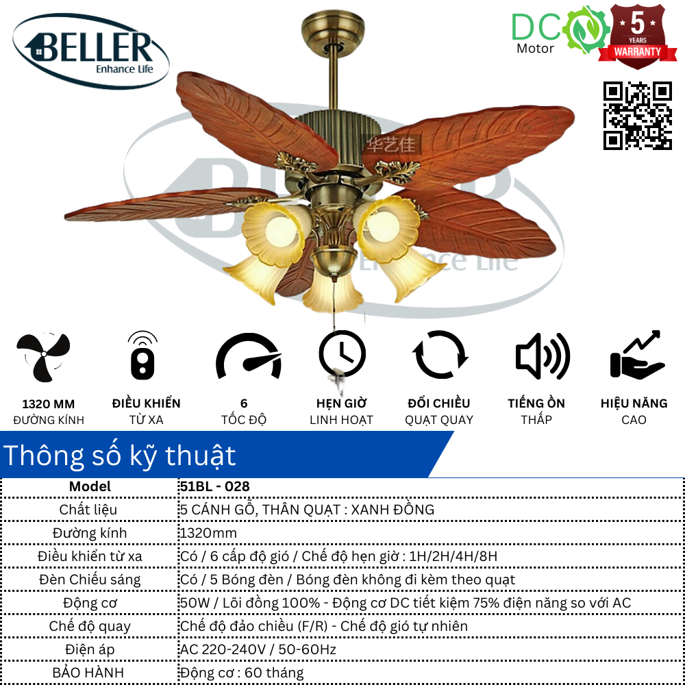 Quạt trần 51BL – 028 động cơ DC 6 tốc độ gió,công suất động cơ lên tới 50W, động cơ khoẻ, lắp lên mát, độ tản gió rộng, quạt có đầy đủ chế độ đảo chiều, chế độ hẹn giờ thông minh ….quạt còn được kết hợp với đèn chiếu sáng, chùm đèn 5 chao làm bằng thuỷ tinh, giúp cho ánh sáng được nhẹ và ấm hơn